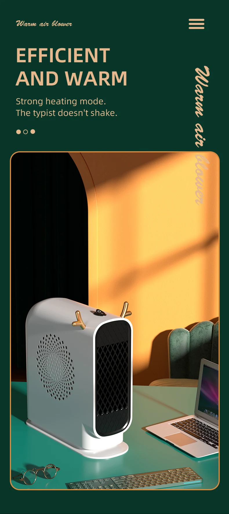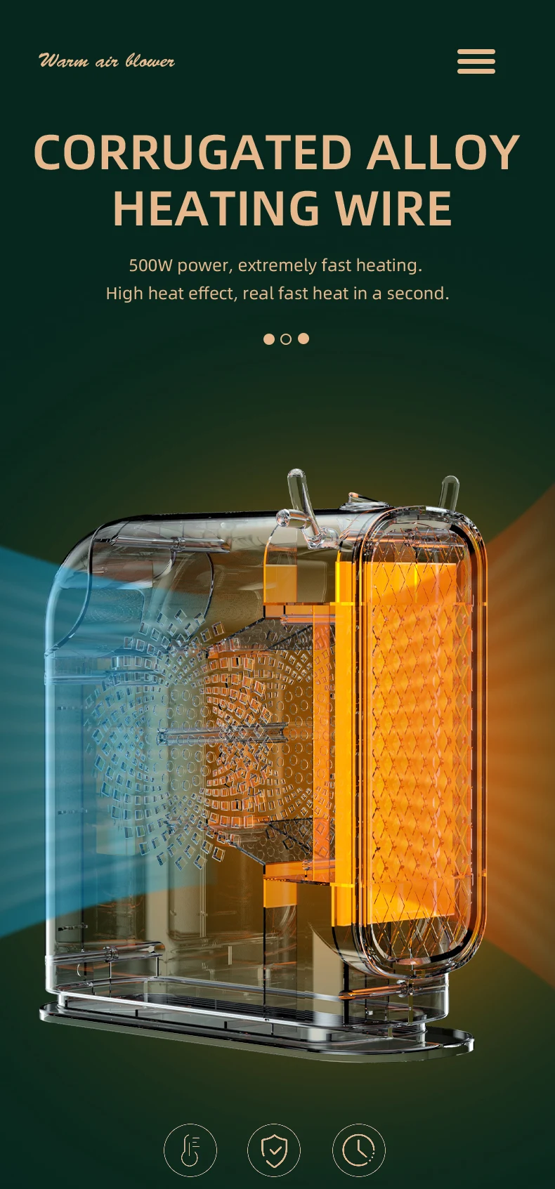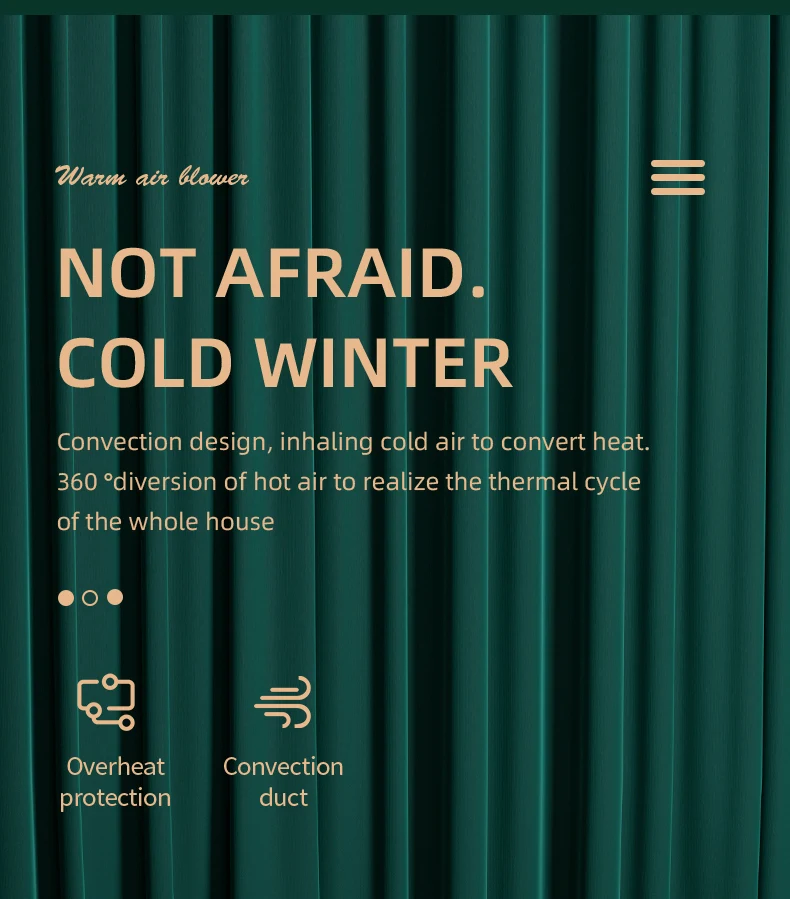 2. High thermal efficiency: Double sided air intake, accelerating heat conversion; Cycle heating, enjoy the whole house.